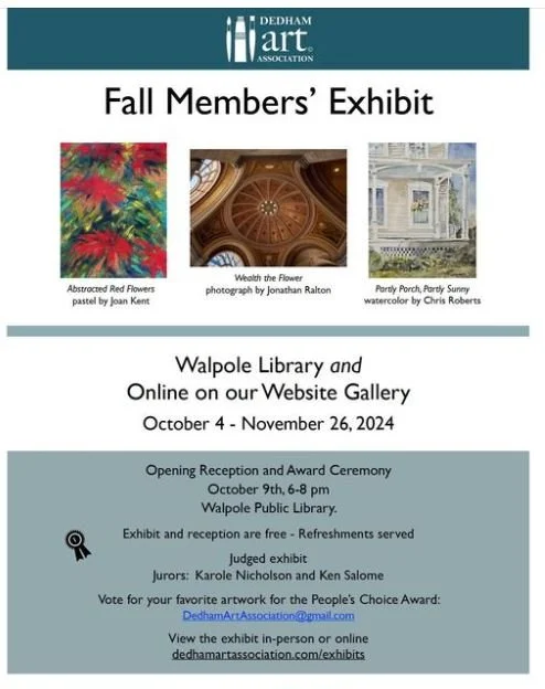 Dedham Art Association will be exhibiting and selling small artworks. Members Brian Reddy and Naomi Wilsey will show their paintings, drawings, prints and crafts.
